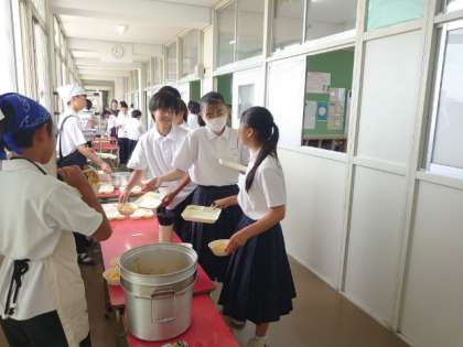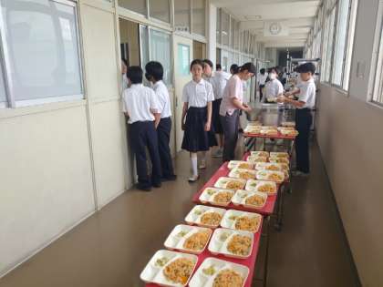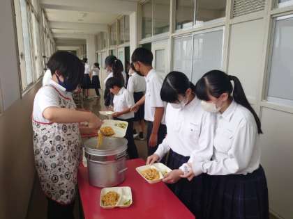 お昼休みになり、1年生の教室前で給食の配食が行われています。今日は「チキントマトスパゲッティ・アスパラガスのサラダ・芋けんぴフィッシュ」の洋風献立。アスパラガスはカロチンたっぷりの栄養野菜。病気に対する抵抗力を高めるそうですよ。