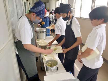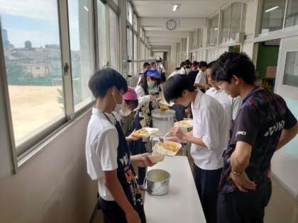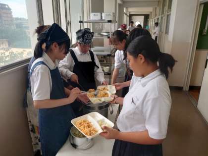 2年生の皆さんも給食の配食中。スパゲッティやサラダを取り分ける人や、給食のトレイを受け取る人など、互いに協力しながら準備が進みます。みんなで美味しくいただいてくださいね。