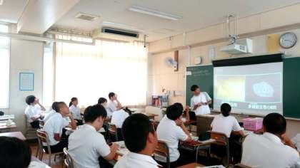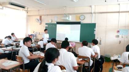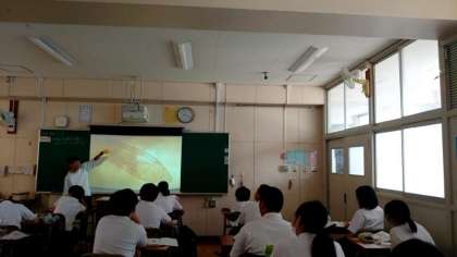 2年生理科の授業で「単細胞生物の特徴」を学習します。今日は映像を視聴して、特徴を教わります。スクリーンには、アメーバやゾウリムシの映像が流れます。1個の細胞からできている生物は不思議ですね。