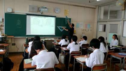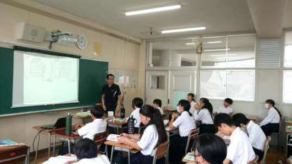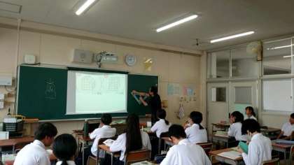 1年生技術の授業で「製図」の実習中。今日は「等角図」を作図します。物体を斜め上から眺めるように描きます。先生が定規を使って作図の手順を説明します。皆さん、定規を上手く使ってチャレンジしましょう。