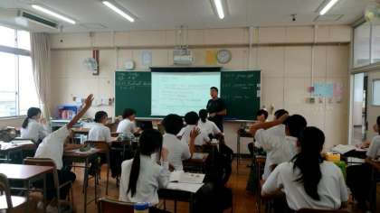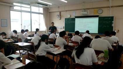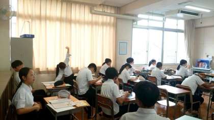 2年生英語の授業で「動名詞」を学習します。現在「 finish + 〜ing (〜を終える)」の構文を教わります。例文の「お風呂の使用が終わりました」にちなんで、先生から「生徒の皆さんは何分位お風呂やシャワーを使いますか?」と英語で質問が。皆さん、上手く答えられましたか?