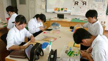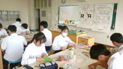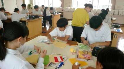 3年生家庭科の授業で取り組んでいる「フエルト製の絵本」。皆さん、ハサミやボンド(接着剤)を使って作品を製作中。黒板に掲示されているヒントを参考に、ステキな絵本に仕上げてくださいね。