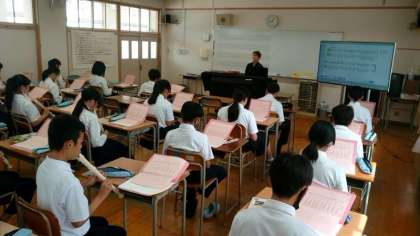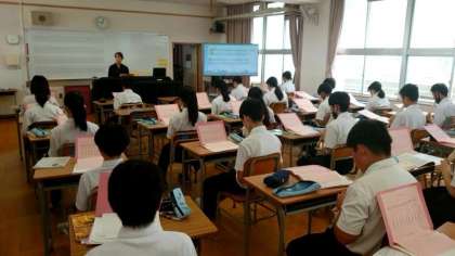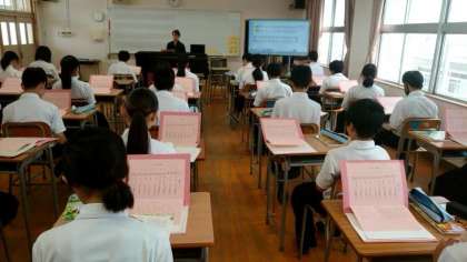 1年生の皆さんが音楽室でリコーダーを練習しています。先生のピアノの合図で「ド・レ・ミ・ファ‥」と演奏します。タンギングが苦手な人は、この夏休みにお家で練習してくださいね。