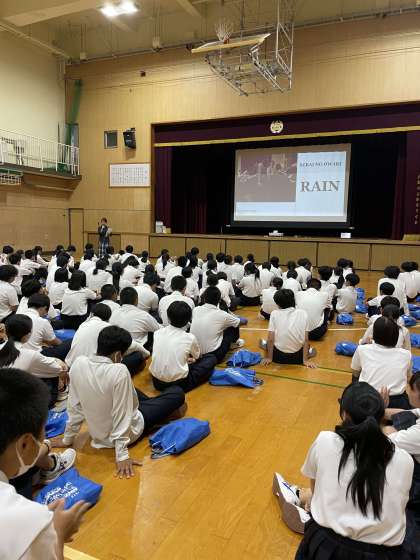学年集会のなかでかねてより検討していた文化発表会での合唱曲のアンケート集計結果が発表されました。2曲歌うなかで音楽の教科書にも載っている『やさしさに包まれたなら』は決定していましたが、J-POPでも1曲!ということでいろんな意見が出ていました。委員長会で厳選し、音楽の授業で全員にアンケートをとった結果、