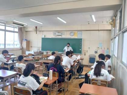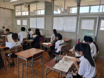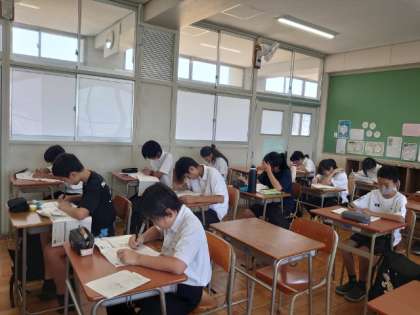 1年生の皆さんが夏休みの学習会にやってきました。今日は英語を中心に取り組みます。多くは夏休みの宿題を解いているようです。わからない点があれば、どしどし質問しましょう。