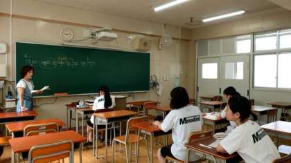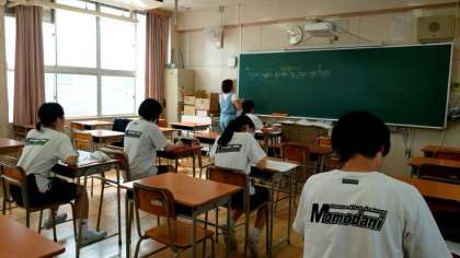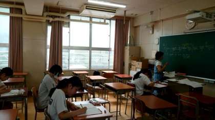 3年生の教室では、英語の学習会が行われています。先生が英文の語句の並び替えや、文法・語彙(ごい)の問題の解き方を説明中。高校入試でよく出題されるので、しっかりとマスターしてくださいね。