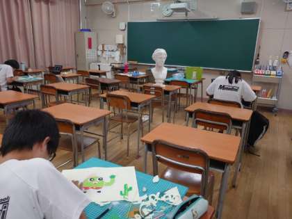 美術部の皆さんが制作活動を頑張っています。タブレット端末を使って制作に関連するデータを検索したり、好きなキャラクターの作品を作ったり、それぞれ楽しく活動しています。秋の文化発表会での発表が楽しみです。