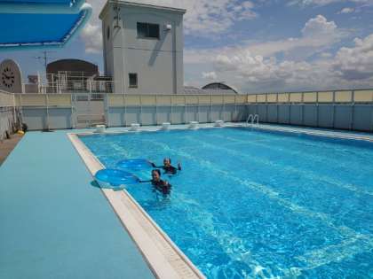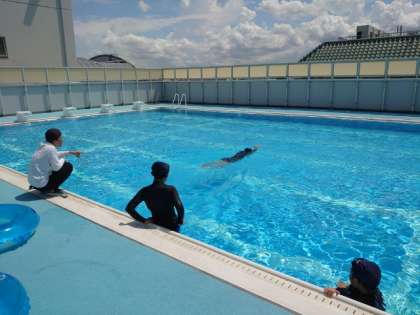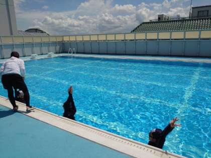 校舎屋上のプールでは、1年生が水泳の練習に取り組んでいます。先生から「け伸び」のフォームを教わります。プールの壁を蹴り、伏し浮きの状態で進みます。皆さんとても上手にできていますね。