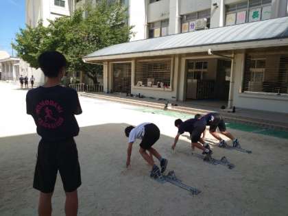 運動場では、陸上部の皆さんが気持ち良い汗を流しています。スターティングブロックをセットし、クラウチングスタートの練習中。前方に倒れるように走り出すと、身体を前に進める力が生まれるとのこと。繰り返しチャレンジして身に付けましょう。