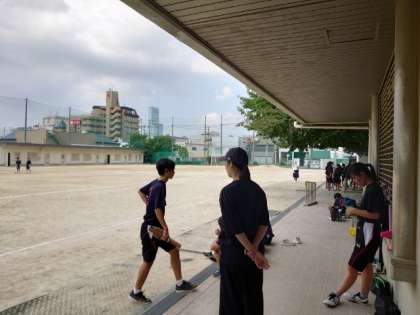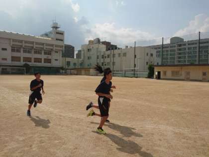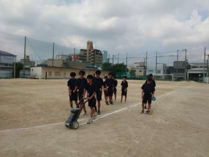 運動場では陸上部の皆さんが練習に励んでいます。先輩が1年生にラインの引き方を教えています。スムーズに準備するのも練習の1つ。1年の皆さん、先輩からいろいろ教わってくださいね。