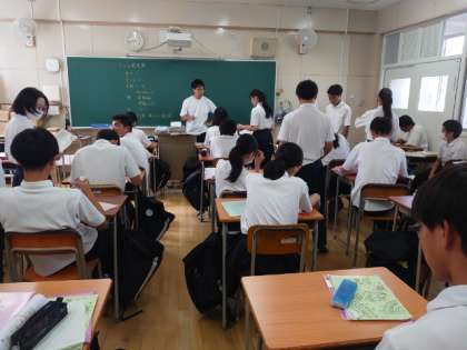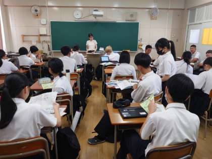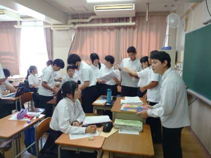3年生の教室では、体育大会の学級旗(応援旗)のデザインを集めています。力強いデザインやお菓子のパッケージのパロディなど、ユニークな作品が並びます。どのデザインが選ばれるか楽しみです。