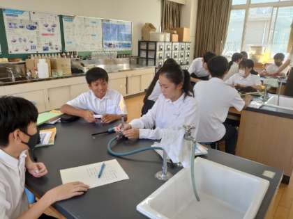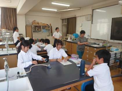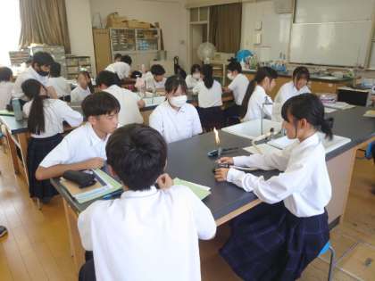 1年生の皆さんが理科室にやってきました。これから「ガスバーナー」の扱い方を実習します。空気調節とガス調節の2つのネジを操作して、バーナーの火を青色に調整します。皆さん、事故の無いよう、慎重に操作していますね。