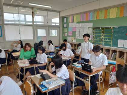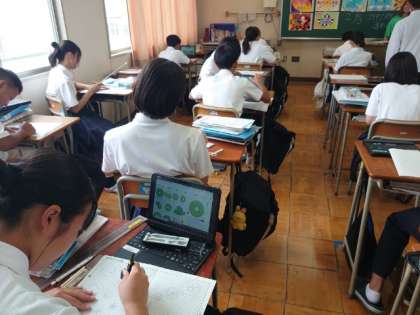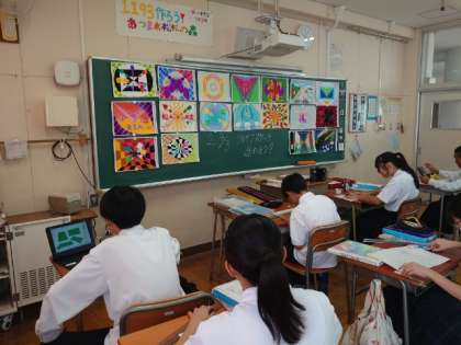 2年生美術科で「遠近感のある平面構成」の作品制作がスタートしました。皆さんタブレット端末を使って、参考となるデザインを検索中。黒板には先輩方が描いた作品が掲示されています。色づかいなど、とても参考になりますね。