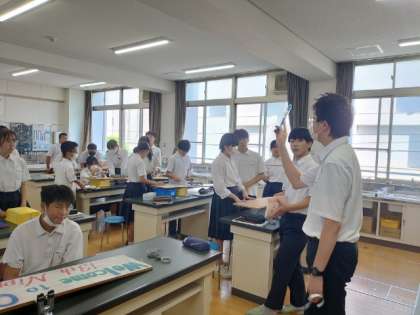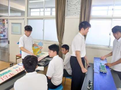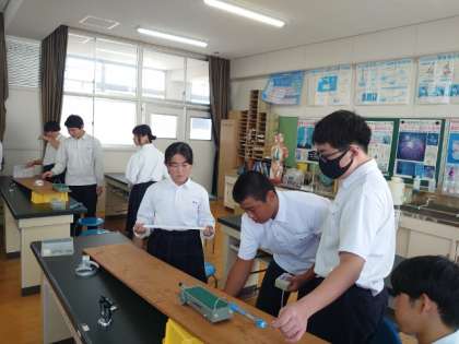 3年生理科の授業で「台車の運動」を実験します。前回は水平な面を移動する際の記録を測りました。今日は斜面での台車の運動を記録します。斜面の角度によって、運動がどう変化するかを確かめましょう。