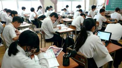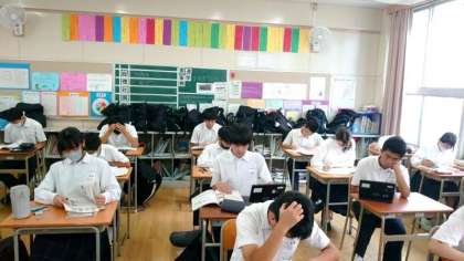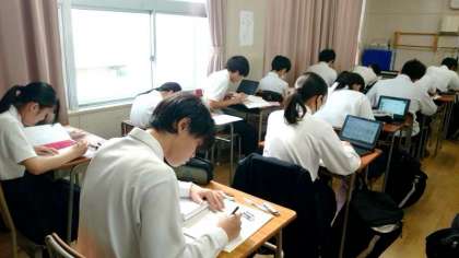 今日は3年第2回実力テスト。現在、各教室ではテスト勉強の真っ最中。ノートやワークを広げて復習する人や、タブレット端末で学習内容を確かめる人など、それぞれのスタイルで自学自習を進めます。皆さんの健闘を祈っています!
