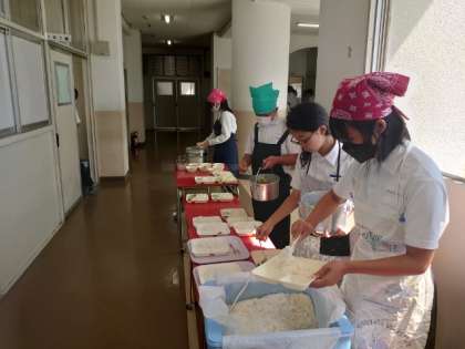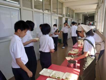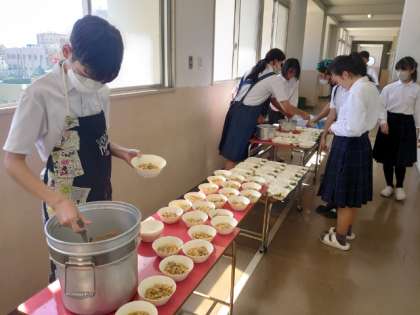 4時間目の授業が終わり、1年生の皆さんが給食の配膳中。今日の献立は「他人丼・鶏と野菜の炒め物・オクラの甘酢和え」。昆布と削り節の香りが絶品の他人丼。つゆだくが良い人はお願いしてみては?