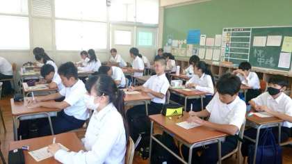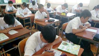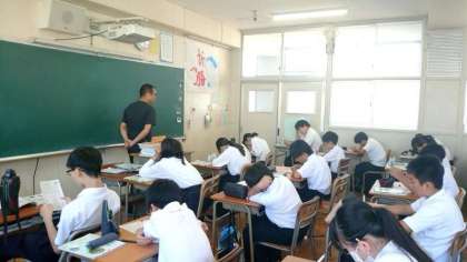 1年生技術の授業で小テストが行われています。来週実施される中間テスト(技術家庭科)に向けて、これまでの学習内容を振り返ります。わからない問題は、教科書やプリントを見て、しっかりと思い出しましょう。