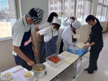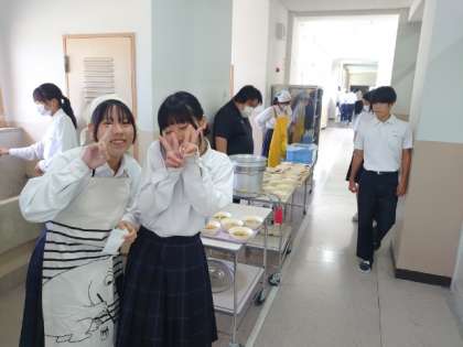 午前の授業が終わり、3年生の皆さんが給食の配膳を行っています。今日は「ヤンニョムチキン・切り干し大根のナムル・豆腐と野菜のスープ」の韓国メニュー。揚げた鶏肉を甘辛く味付けしたヤンニョムチキンはご飯がすすみそう。皆さん、たくさんいただいてくださいね。