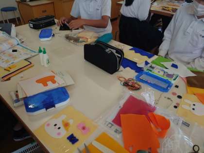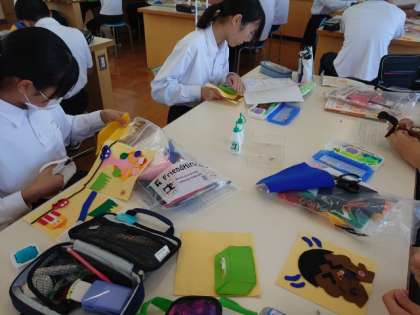 3年生家庭科で製作している「幼児向けの布製絵本」。色とりどりのフエルトを使って、物語のキャラクターを作っています。ウサギやくまさんなど、上手にできているようです。可愛い絵本になりそうですね。