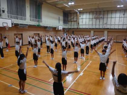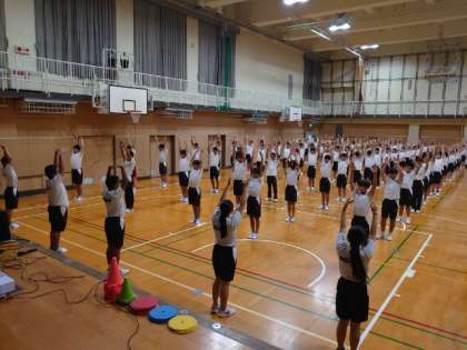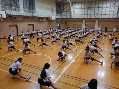 2年生の皆さんが体育館に集まり、体育大会の練習に取り組んでいます。まずは準備体操 (ラジオ体操・ストレッチ) から。みんなで声を出しあって、雰囲気を盛り上げます。