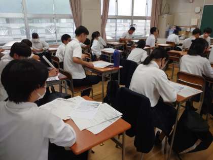 3年生英語科で中間テストの答案が返されています。満足いく結果だった人、悔しかった人さまざまな様子。結果の良し悪しだけで終わらせず、次に向けて奮起する機会にしてくださいね。頑張れ!3年生!