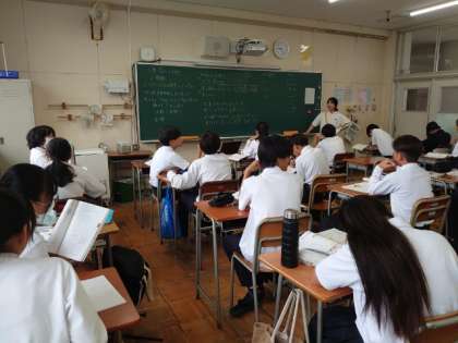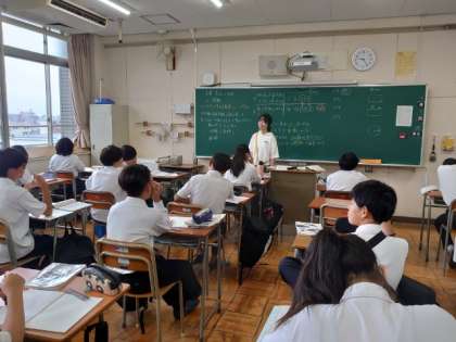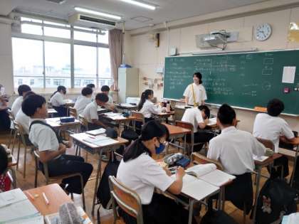 1年生数学科で「関数」の授業が始まりました。x の値が決まると、y の値が1つ決まる場合に「 y は x の関数」と呼ぶとのこと。先生が例題を示して、それぞれの例題が関数かどうかを考えます。 y の値が1つになることがポイントですね。