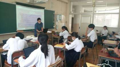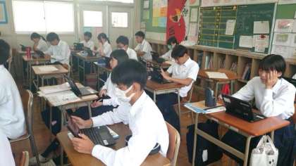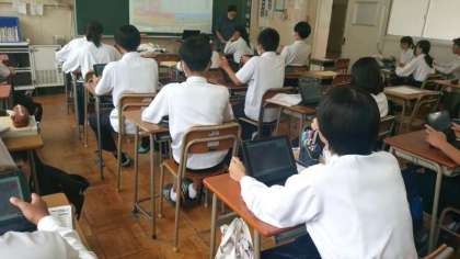 2年生社会科で「幕末の出来事」について復習します。スクリーンには幕末に関する問題がクイズ形式で出題されます。生徒の皆さんはタブレット端末を使って素早く回答。正答数の多い人がランキングで表示されるので力が入りますね。