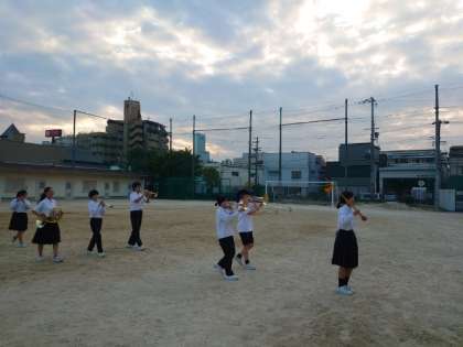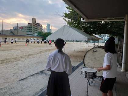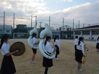 放課後の運動場で吹奏楽部の皆さんが練習に励んでいます。入場行進の楽曲を演奏しながら、行進します。隊列を美しく保って演奏するのは、けっこう難しいですね。当日のパフォーマンスが楽しみです。