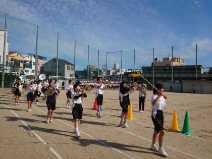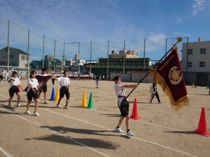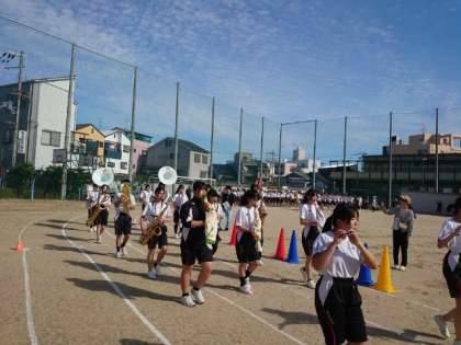 開会式の入場行進が始まりました。生徒会役員の皆さんが校旗を高らかに掲げ、入場してきました。吹奏楽部の皆さんの演奏が光ります。