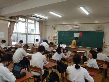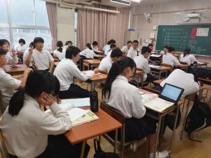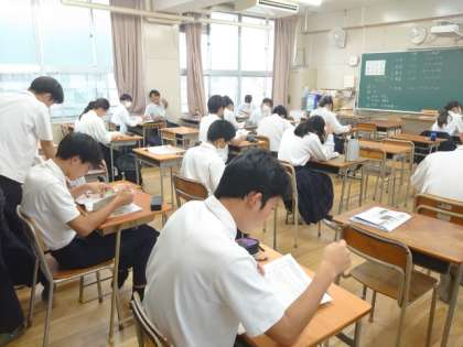 テスト開始前の3年生の教室では、皆さん熱心にテスト勉強に取り組んでいます。ノートやプリントを繰り返しチェックする人、互いに問題を出し合う人などスタイルはさまざまです。今日1日、ベストを尽くしましょう!