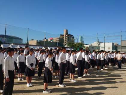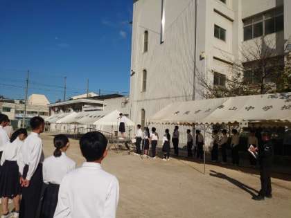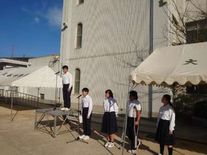 月曜の朝は全校集会。澄んだ青空の下、皆さん運動場に集まります。今朝は生徒会の各委員会より目標の発表がありました。後期のメンバーになって初めての報告を、しっかりと伝えてくれましたね。