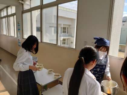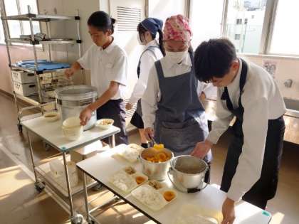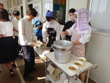 午前中の授業が終わり、2年生の教室前では給食の準備が進んでいます。今日のメニューは「中華丼・もやしとコーンのごま炒め・黄桃」です。豚肉と野菜をたっぷり煮込んだあんかけ具材は白ご飯に合いますね。皆さん、たくさんいただきましょう。