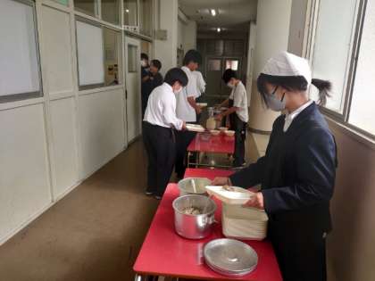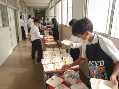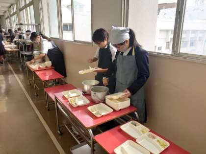 お昼休みのチャイムが鳴り、1年生の教室前で給食の準備が始まりました。今日は「カツオのガーリックマリネ焼・ウィンナーとじゃがいものスープ・キャベツのサラダ」の洋風献立。マヨネーズ風味のカツオのガーリック焼は、濃いめの味付けがパンに合いそう。あっさりスープと一緒にいただきましょう。