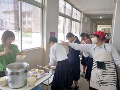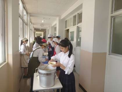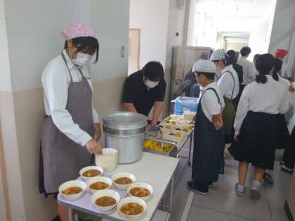 午前中の授業が終わり、3年生の皆さんが給食の準備中。今日は「ポークカレーライス・ほうれん草のソテー・ミカン」の人気メニュー。カレーをいただいた後のデザートにミカンはぴったりですね。皆さん、美味しくいただきましょう。