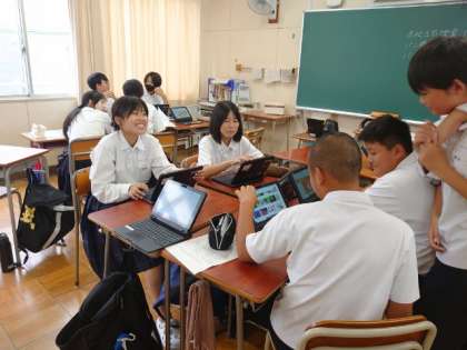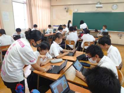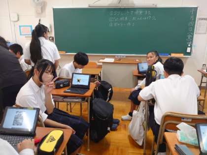 2年生各クラスで考えたオリジナル「創作パン」。11月3日に開催される桃中祭での販売に向けて、パンの宣伝ポスターを製作しています。タブレット端末を使って、パンの写真やキャッチフレーズを上手にレイアウトしていきます。カラフルでステキなポスターになりそうですね。