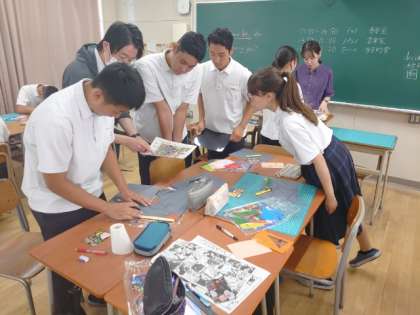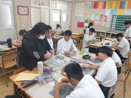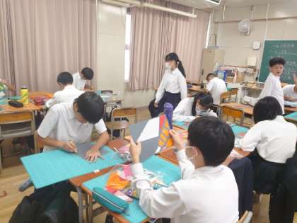 3年生の教室では「巨大ステンドグラス」の制作が進んでいます。全員が協力して作品を作り上げます。カッターナイフを使ってパーツを切り取り、色セロハンを貼っていきます。ケガにはくれぐれも気をつけてくださいね。