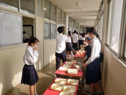 午前中の授業が終わり、1年生の教室前で給食の配食が行われています。今日の献立は「鶏のカレー風味焼き・豚と野菜の煮込み・野菜のソテー」。鶏肉をグリルし、カレー風味に仕上げた料理はパンに合いそうですね。お野菜たっぷりの煮込みと一緒にいただきましょう。