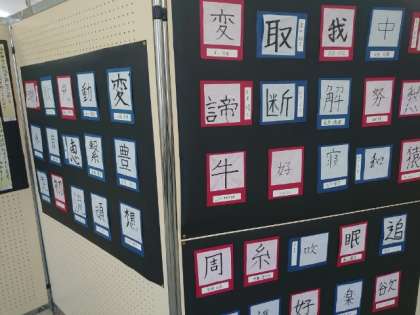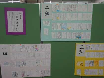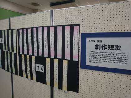 4階グローバル教室では、国語科の作品が展示されています。1年は暑中見舞い、2年は創作短歌、3年は自分を表す漢字を出品しています。