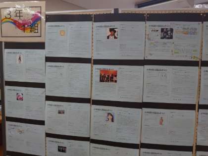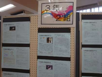 1階図書室には3年生音楽科で取り組んだ「音楽レポート」が出品されています。自分の『推し』の音楽 (アーティストや楽曲)を紹介します。皆さんの熱い思いが綴られています!