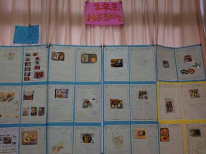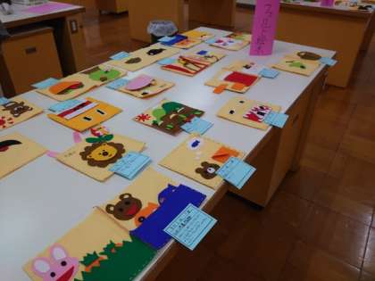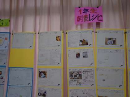 4階被服室には家庭科の作品がずらりと並びます。1年生はオススメの朝食のレシピと授業で作ったピンクッションを、2年生は夏休みに実際に作った自慢の創作弁当のレポートが、3年生は幼児向けのフエルト絵本と幼児食のレシピが展示されています。いずれも時間をたっぷりかけた力作ばかりですね。
