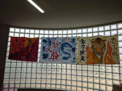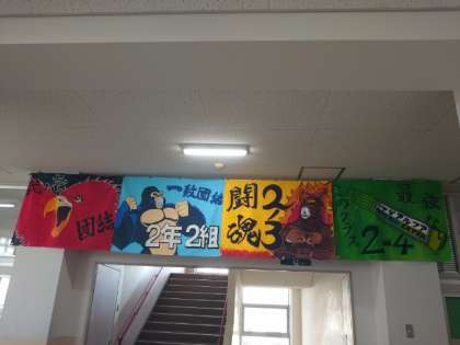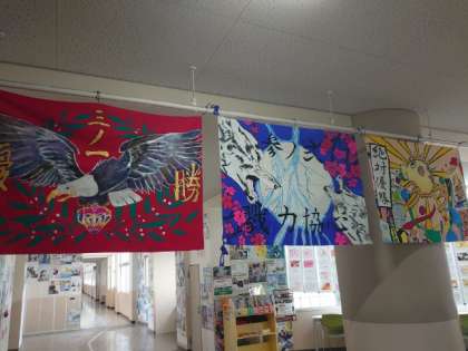 校舎2階から4階の踊り場には、体育大会で制作したクラスの応援旗が飾られています。赤・青・黄・緑のクラスカラーを基本に、力強さやユニークさが表現されています。クラスの団結を示すシンボルの旗。いずれもステキです。