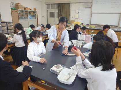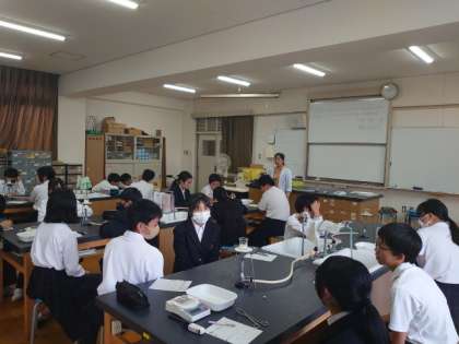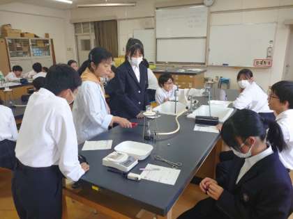 1年生の皆さんが理科室で何やら実験中。今日は「物質の状態変化」を学びます。ろうそくに使われる固体のロウを熱して液状にすると、体積・質量がどう変化するかを調べます。ガスバーナーを使ってロウを熱すると