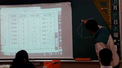 2年生数学の授業で「多角形の内角の和」の求め方を教わります。多角形の1つの頂点から、それぞれの頂点に線を引くと、いくつかの三角形に分かれます。多角形の頂点の数を n として「180° × (n−2)」の式を使うと、内角の和を求めることができるそうですよ。