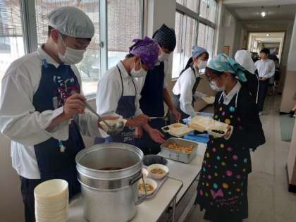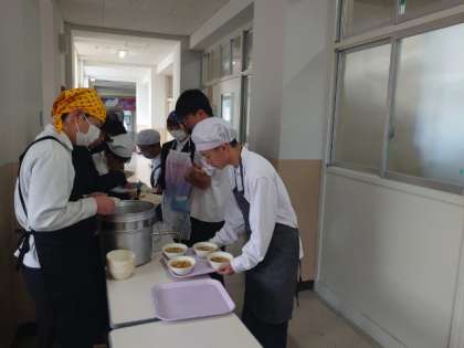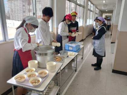 午前の授業が終わり、3年生の皆さんが給食の準備を行っています。今日は「イカの天ぷら・鶏と野菜の五目汁・海苔の佃煮」の和風献立。お出汁が効いた佃煮は白ごはんに合いますね。皆さん、よければお代わりしてください。