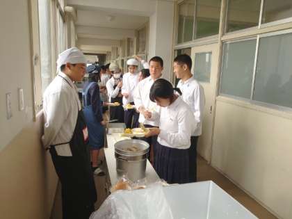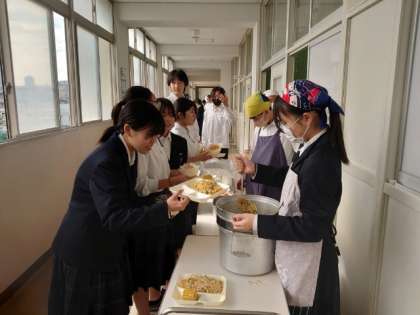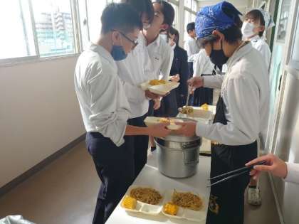 お昼休みのチャイムが鳴り、2年生の教室前で給食の準備が始まりました。今日は「ウインナーとキノコの和風スパゲティ・焼きトウモロコシ」の人気メニュー。お醤油の香りがほのかに漂うスパゲティは美味しそうですね。皆さん、たくさんいただいてくださいね。