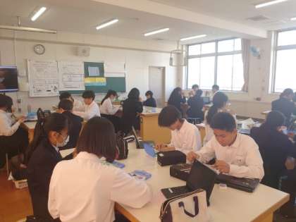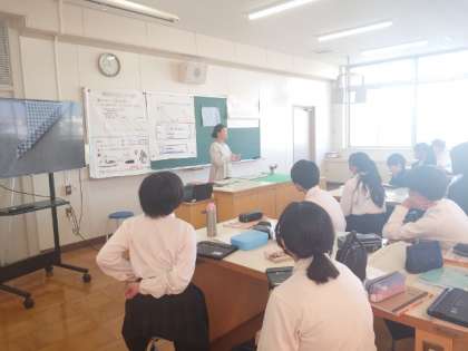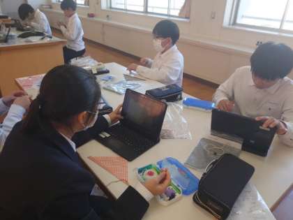 1年生家庭科で布製のランチョンマットを製作します。今日はマットのポケット部分を「まつり縫い」していきます。表に縫い目が見えないように、ていねいに縫い進めます。タブレット端末には、まつり縫いの動画が配信されています。動画で動きを確かめながら、仕上げてくださいね。