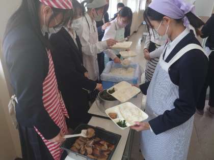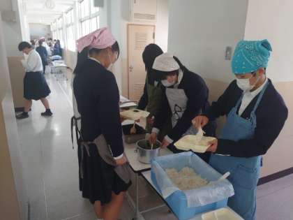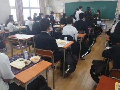 お昼休みのチャイムが鳴り、3年生の皆さんが給食の準備中。今日は「なまりぶしの生姜煮・ホウレン草のゴマ和え・なめこのお味噌汁」の和服献立。なまりぶしは、生のカツオを蒸したり、茹でたりした食材。低カロリー・高タンパクでビタミンやミネラル豊富な健康に良い食べ物だそうですよ。