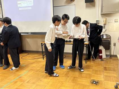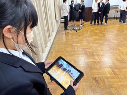 高校出前授業でドローン体験をしています。普段できない経験でとても楽しそうです。