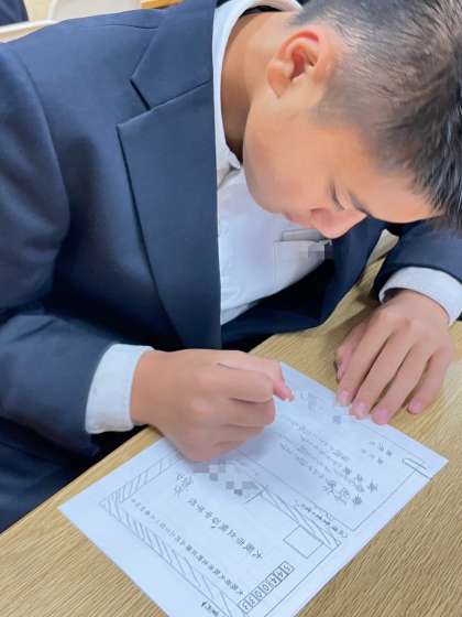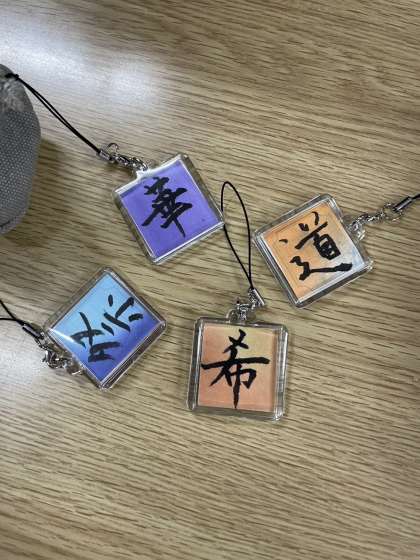 前半は余白の美しさを大切にしたハガキの書式について、後半は漢字ストラップの作品作りに取り組みました。15人の生徒たちは北本先生のユーモアあふれる語り口にすっかり魅了されて楽しんで授業を受けていました。