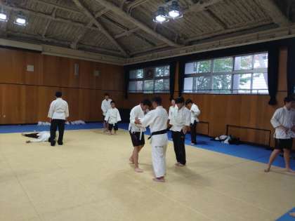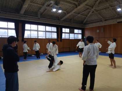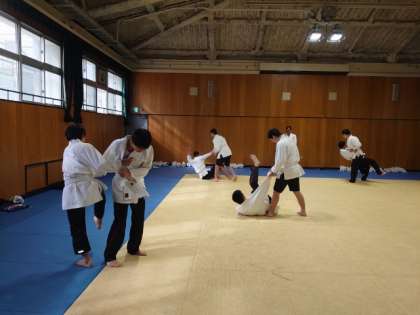 3年男子の皆さんが武道場で柔道の稽古に励んでいます。今日は「大外刈り (おおそとがり) 」の技を習得します。相手の重心を崩して、鎌で草を刈るように重心のかかっている相手の足を払って倒す技だそうです。皆さん、上手く技が決まりましたか?